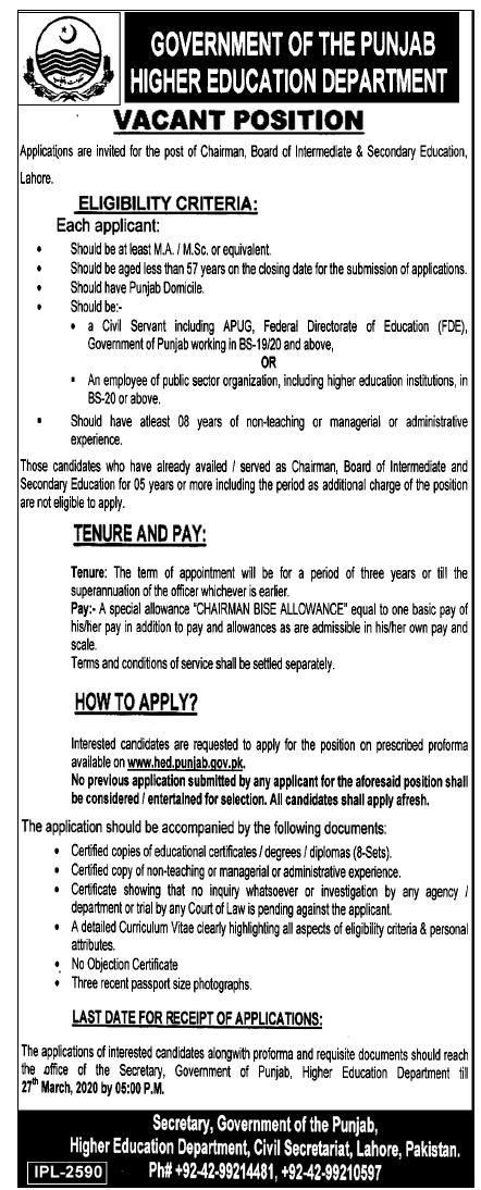 Advertisement and Application Proforma for the Post of Chairman, BISE Lahore