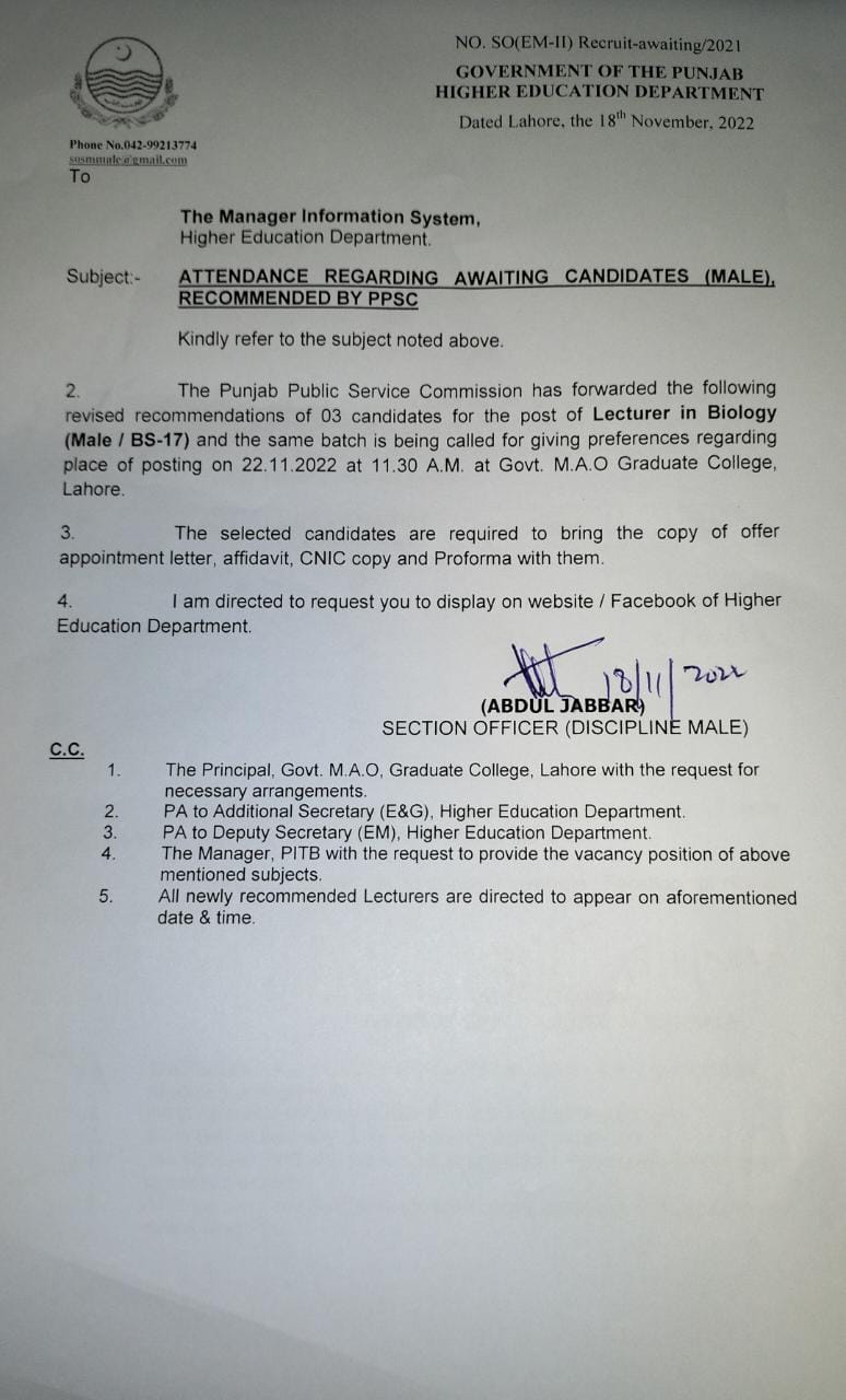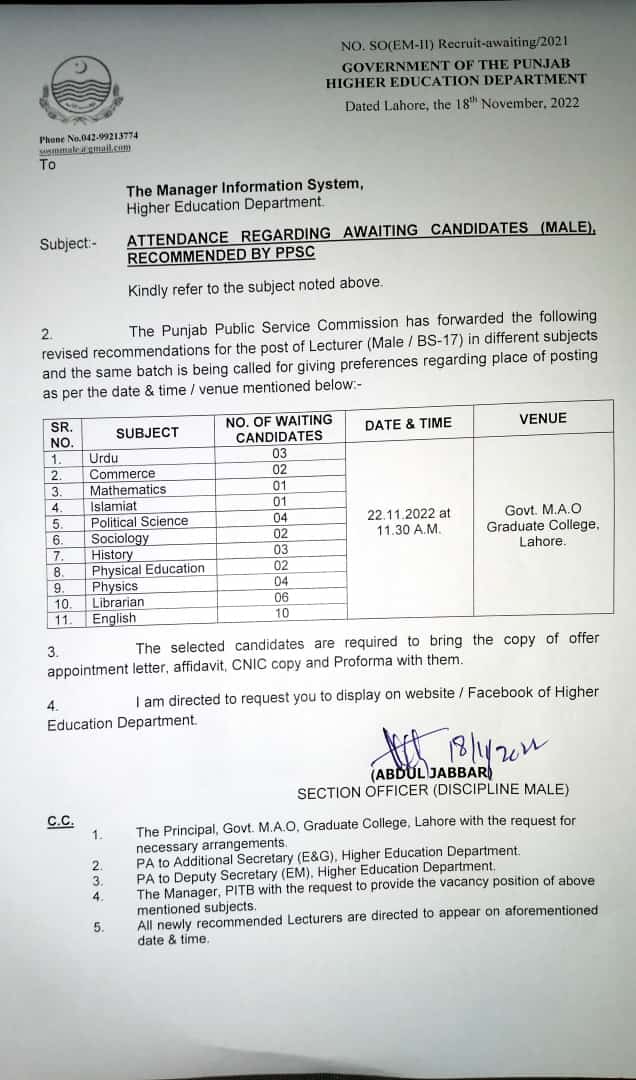 Attendance regarding awaiting candidates (male) recommended by PPSC