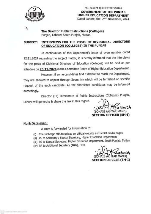 Nov 24, 2024 Interviews for the Posts of Directors of Education (Colleges) has been scheduled on 25-11-2024 Official Letter