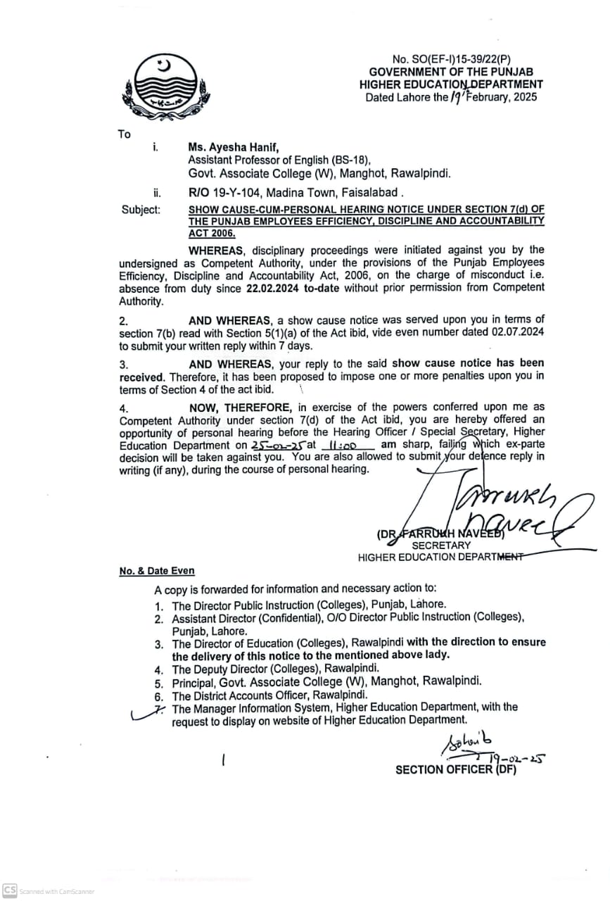 SHOW CAUSE-CUM PERSONAL HEARING TO MS. AYESHA HANIF, ASSITANT PROFESSOR IN ENGLISH