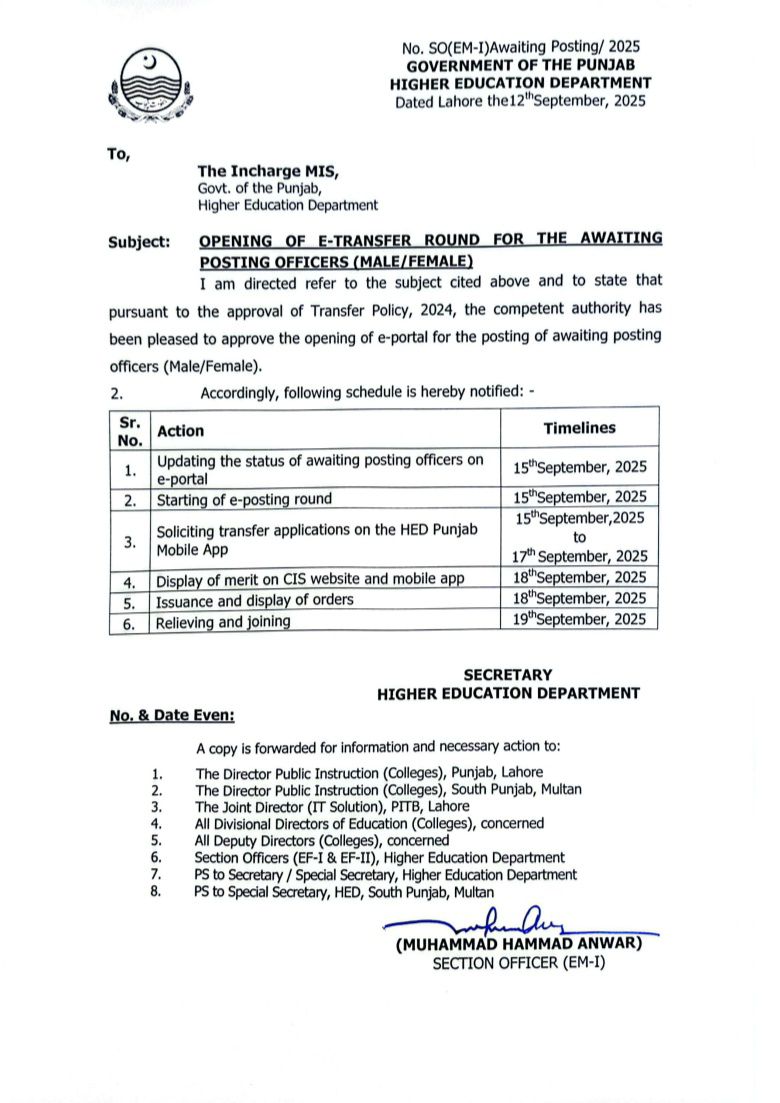 The e-transfer round for awaiting posting officers is now open. Officers are requested to submit their posting preferences through HED Punjab (Andriod Application).