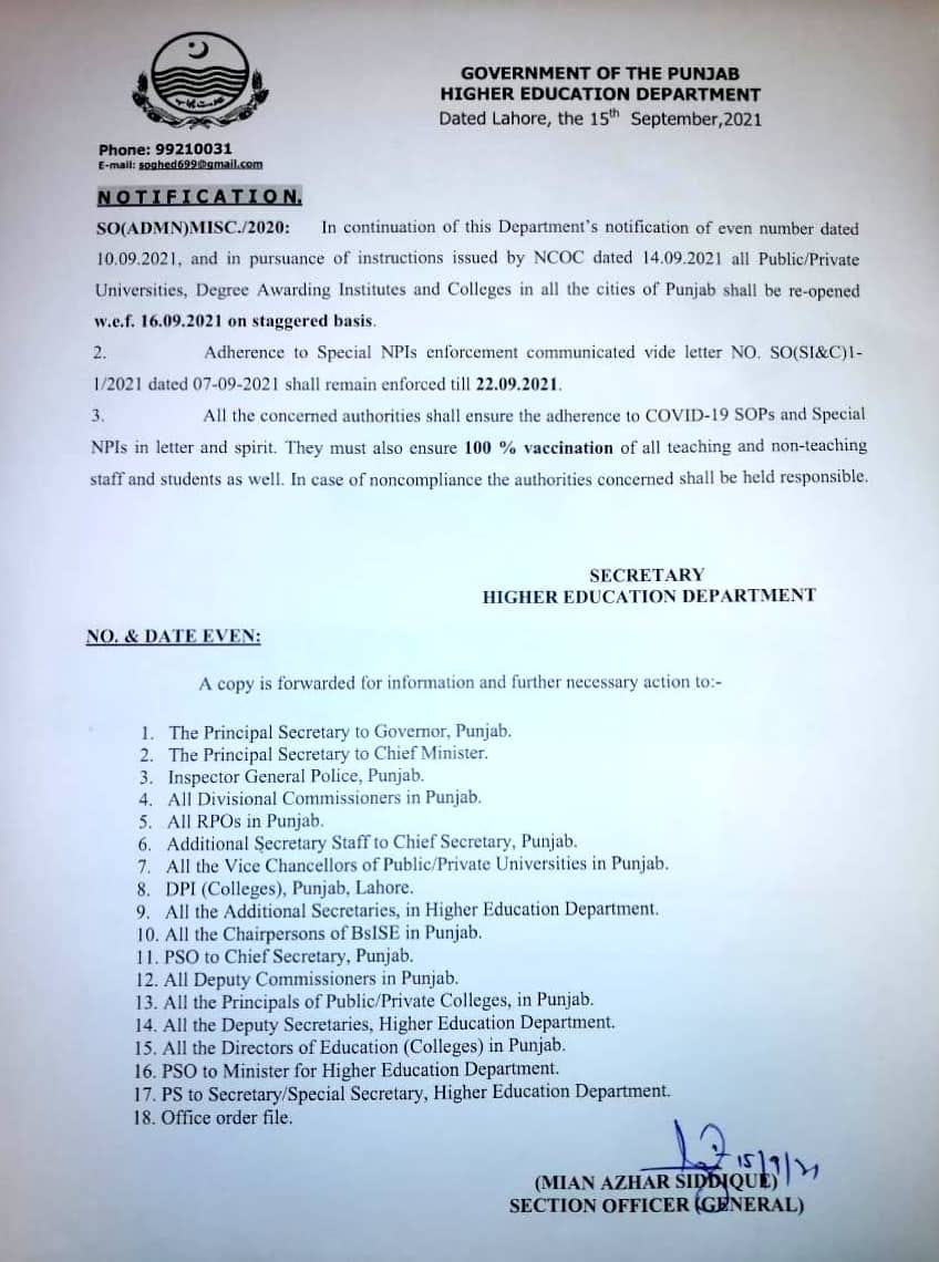 As per decision by NCOC on 14-09-2021 all Public & Private Colleges, Universities & DEIs shall be reopened from 16-09-2021 on staggered basis. 100% Vaccination of Teaching & Non-Teaching Staff is mandatory. For more details ......