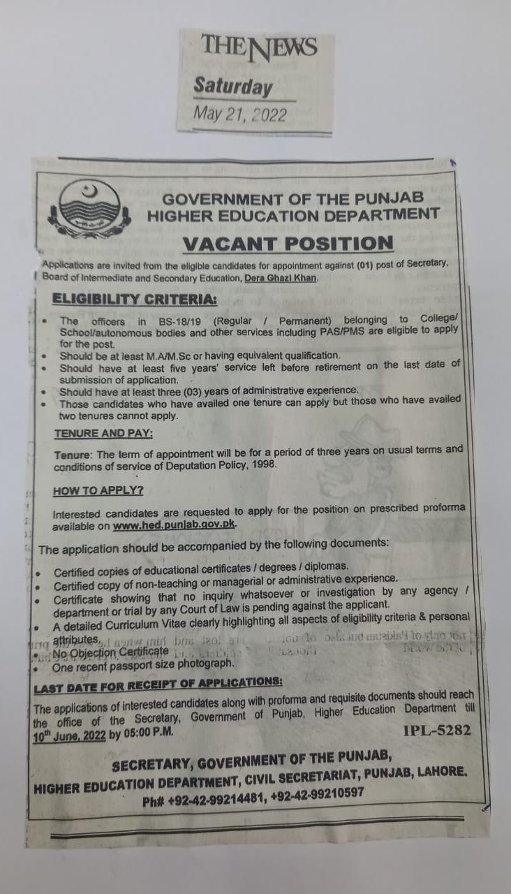 INVITATION OF APPLICATIONS AGAINST VACANT POST OF SECRETARY, B.I.S.E, DERA GHAZI KHAN