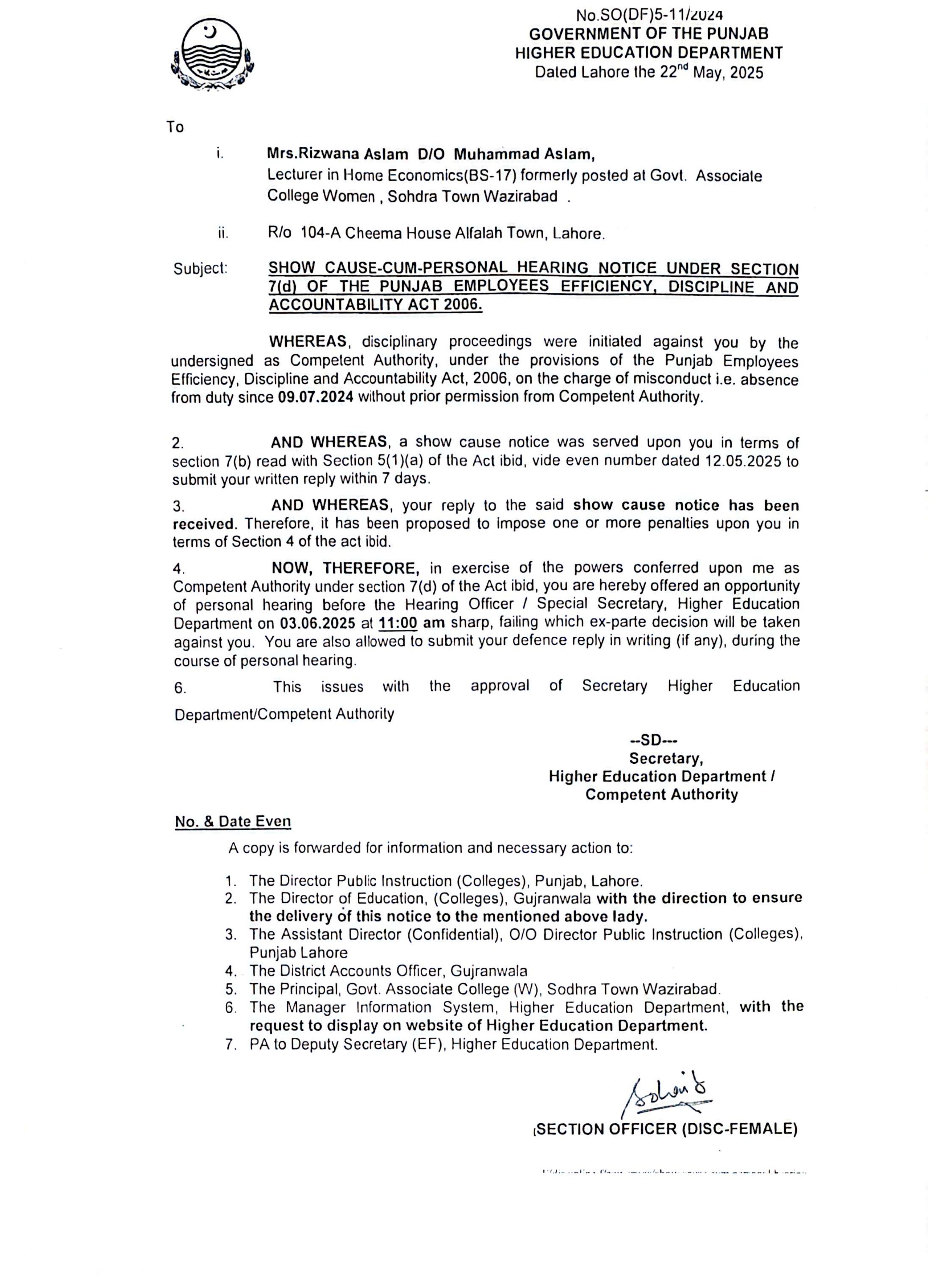 May 23, 2025 Show cause-cum personal hearing of Mrs. Rizwana Aslam Lecturer of Home Economics. Official Letter