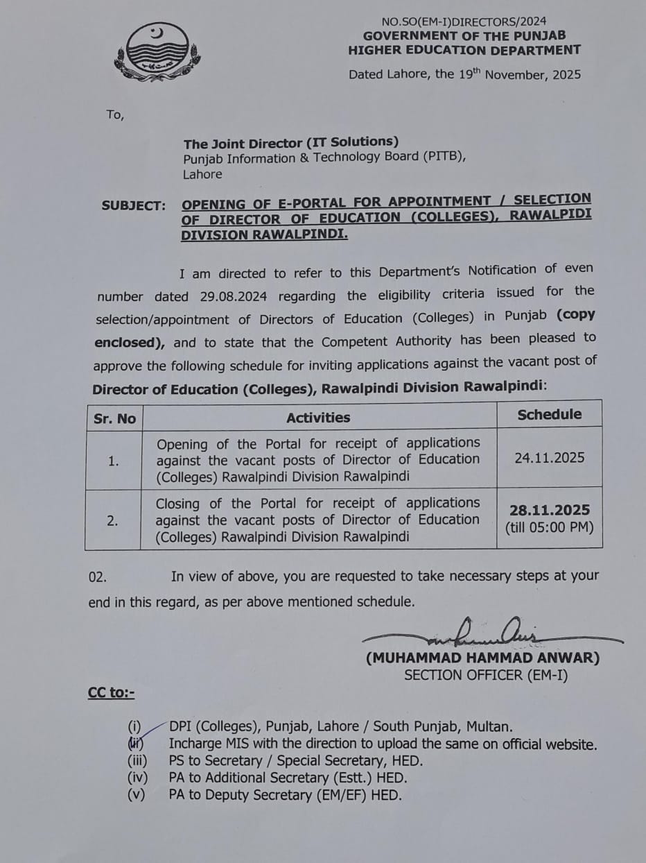 The Higher Education Department (HED) Punjab announced the opening of the E-Portal for applications for the position of Director of Education (Colleges), Rawalpindi Division.