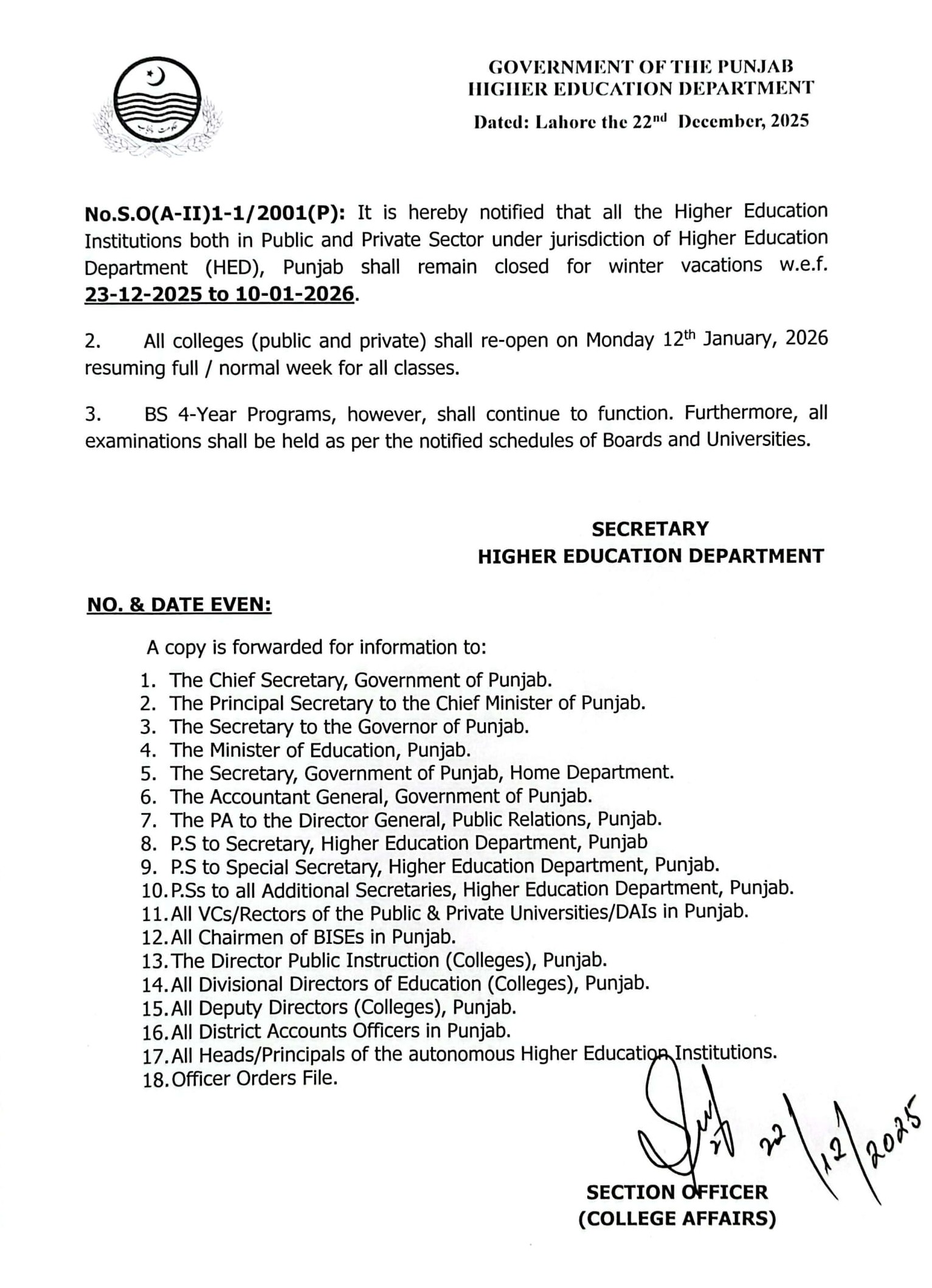 The Higher Education Department (HED), Government of the Punjab, has officially notified the winter vacation schedule for all public and private higher education institutions across the province.